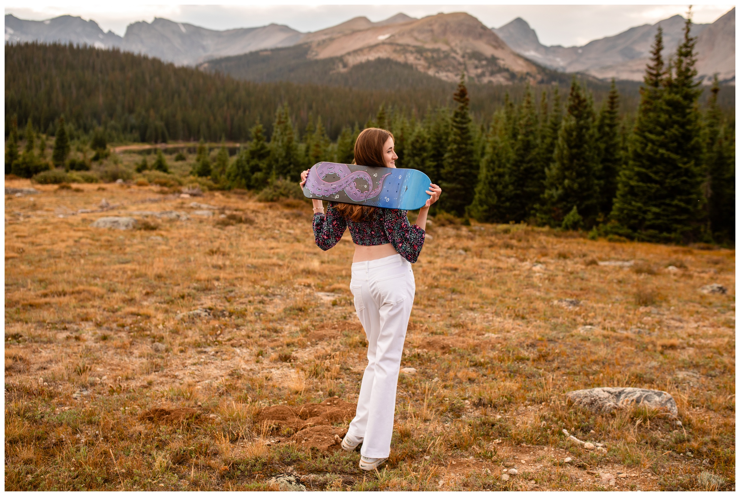 Back up to Brainard Lake Recreation Area for today’s blog post. This time for Claire’s Colorado mountain lake senior pictures. Like every session I had up there this year, it was pretty chilly and we feared the rain would ruin our session. We did get a few minutes of rain. But you know the saying, if you don’t like the weather in Colorado, wait ten minutes. This was oh so true…thankfully! Claire decided on four outfits during her senior session and we incorporated numerous props relating to her love of art. I have photographed a lot of hobbies over the years, but I am pretty sure this was my first artist. She brought some beautiful paintings and pencil drawings, a paint palette, easel, brushes, and even a skateboard that she painted. Absolutely awesome stuff!